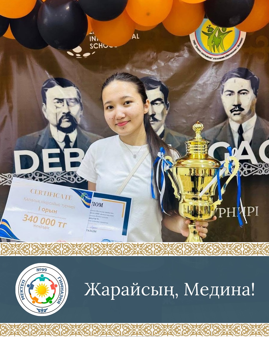 Аталмыш турнирде мектебіміздің мақтанышы, 10-сынып оқушысы Хусаинова Медина APF форматында І орын иеленіп, Zerdeli мектебінің арнайы сыйақысымен марапатталды!