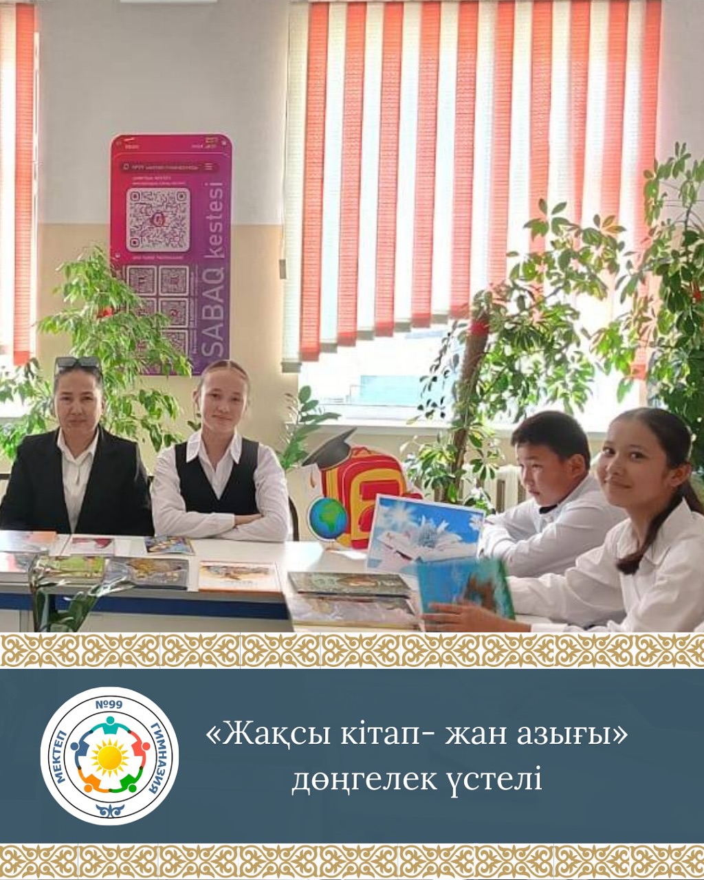 №99 мектеп-гимназия кітапханасының коворкинг орталығында «Жақсы кітап- жан азығы» тақырыбында дөңгелек үстел өтті. Тағылымы мол іс-шара «23 сәуір – Ұлттық кітап күні» аясында 8 сынып оқушыларының қатысуымен өткізілді.Мақсаты: Балалардың ой-өрісін дамыту, кітап оқуға деген сүйіспеншілігін ояту, басқа балаларға оқыған кітабы туралы әңгімелеу, осылайша олардың оқуға деген қызығушылығын арттыру.