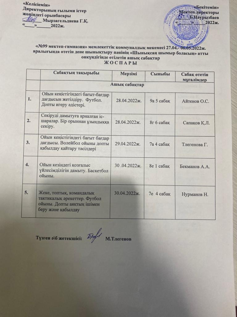27 апрель 2022 0 1 2 3 4 5 Шынықсаң - шымыр боласың” тақырыбындағы онкундігі 99 мектеп-гимназиясының дене шынықтыру пәнінің “Шынықсаң - шымыр боласың” тақырыбындағы онкундігі 27.04-6.05. аралығында өткізілді. Онкүндіктің аясында ашық сабақтар өтілді. Оқушылар мен мұғалімдер арасында жарыстар ұйымдастырылды.